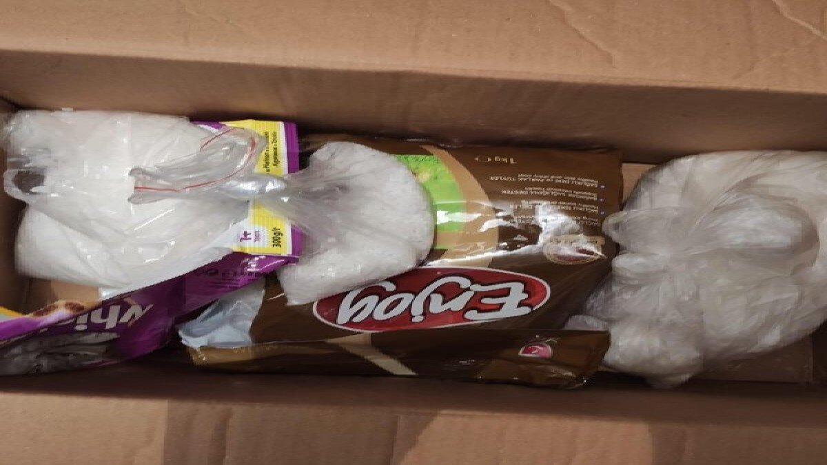 Narkotik madde arama köpeği Zeus ile birlikte yapılan detaylı aramada, evin balkonunda bulunan ahşap koli içerisindeki kedi maması poşetlerine zulalanmış vaziyette; 15 paket halinde toplam 20 kilo 351 gram metamfetamin, 10 gram eroin, 1 adet tabanca, 1 adet şarjör ve 46 adet fişek ele geçirildi.