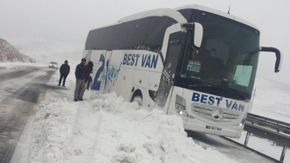 Mersin’den Van istikametine gitmekte olan 65 BJ 299 plakalı şehirler arası yolcu otobüsü, kar engeline takıldı.