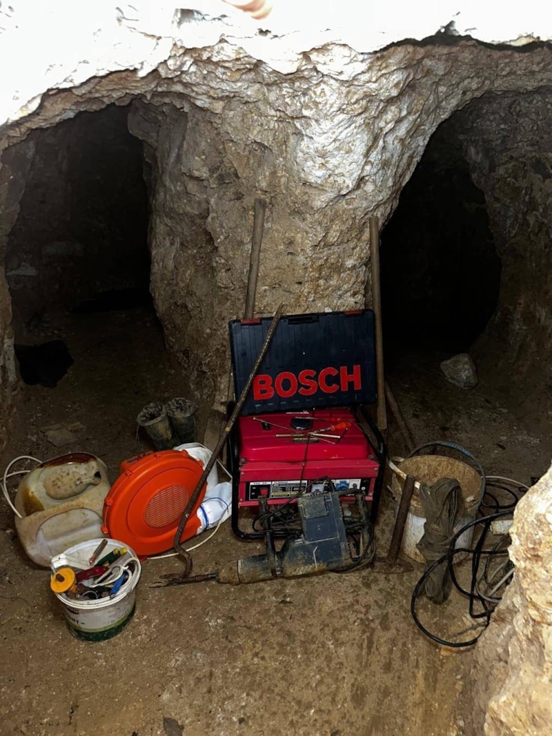 Şüphelilerin kaçak kazı yaptığı yerde yapılan aramada jeneratör, elektrikli hilti, havalandırma fanı, 24 adet çeşitli kazı malzemesi ele geçirildi.