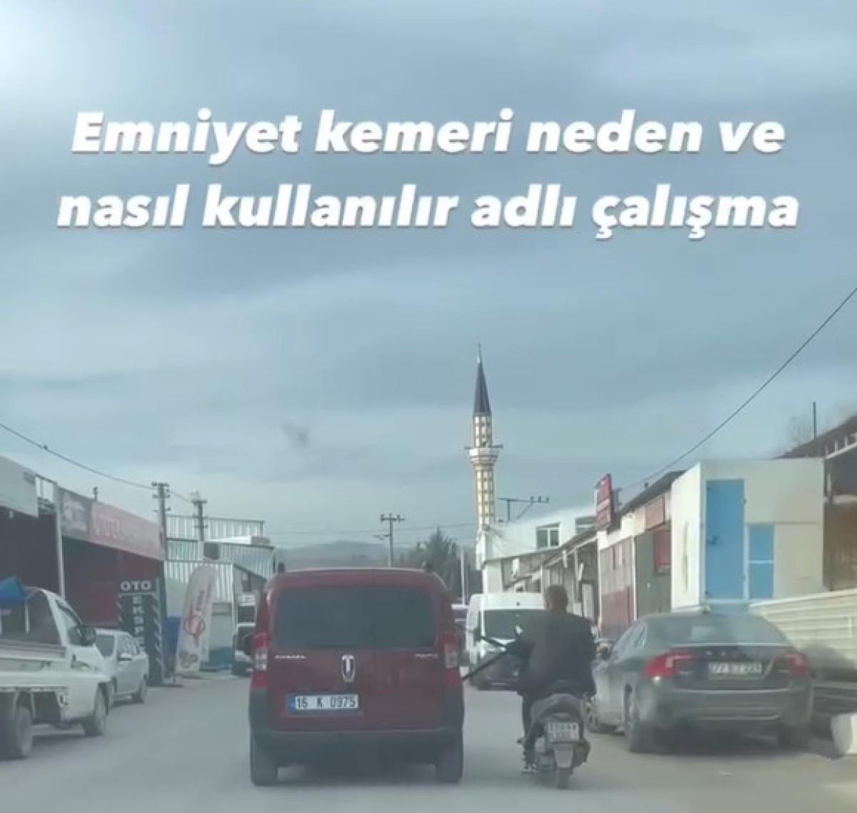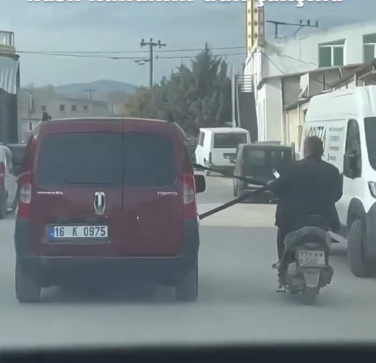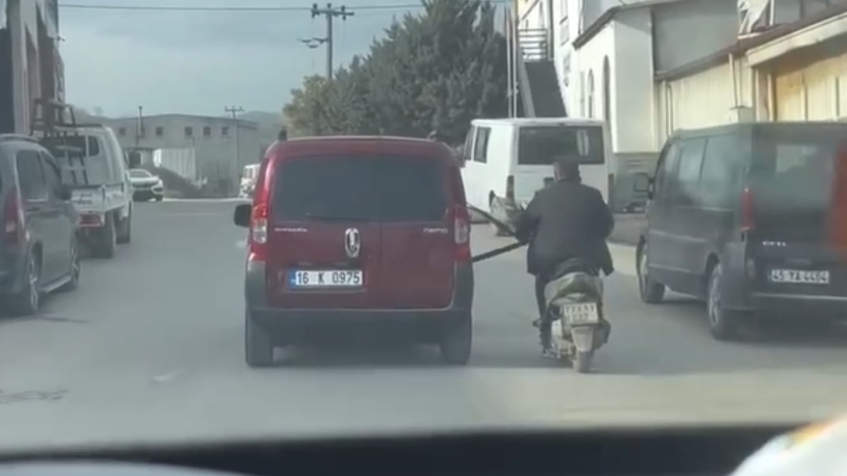 Bir motorun emniyet kemeriyle çekildiğini gören vatandaşlar gözlerine inanamadı.