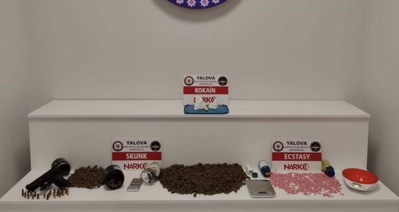 Operasyonda 845 adet ekstazi, 202.80 gram kokain, 558 gram skunk, 1,62 gram Afyon sakızı, tabanca, tabanca fişeği ve 3 hassas terazi ele geçirildi.