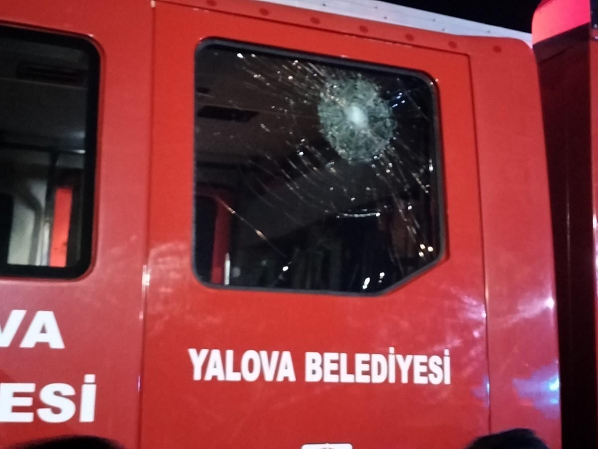Ateşi söndürmeye çalışan ekiplere bölgedekiler taşla saldırdı.