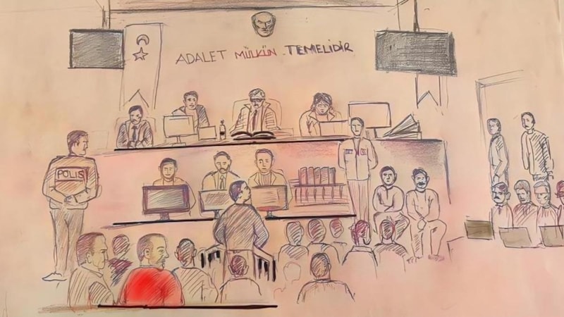 Duruşma salonu, adliye ressamı Cengiz Karslıoğlu'nun çizimine yansıdı.