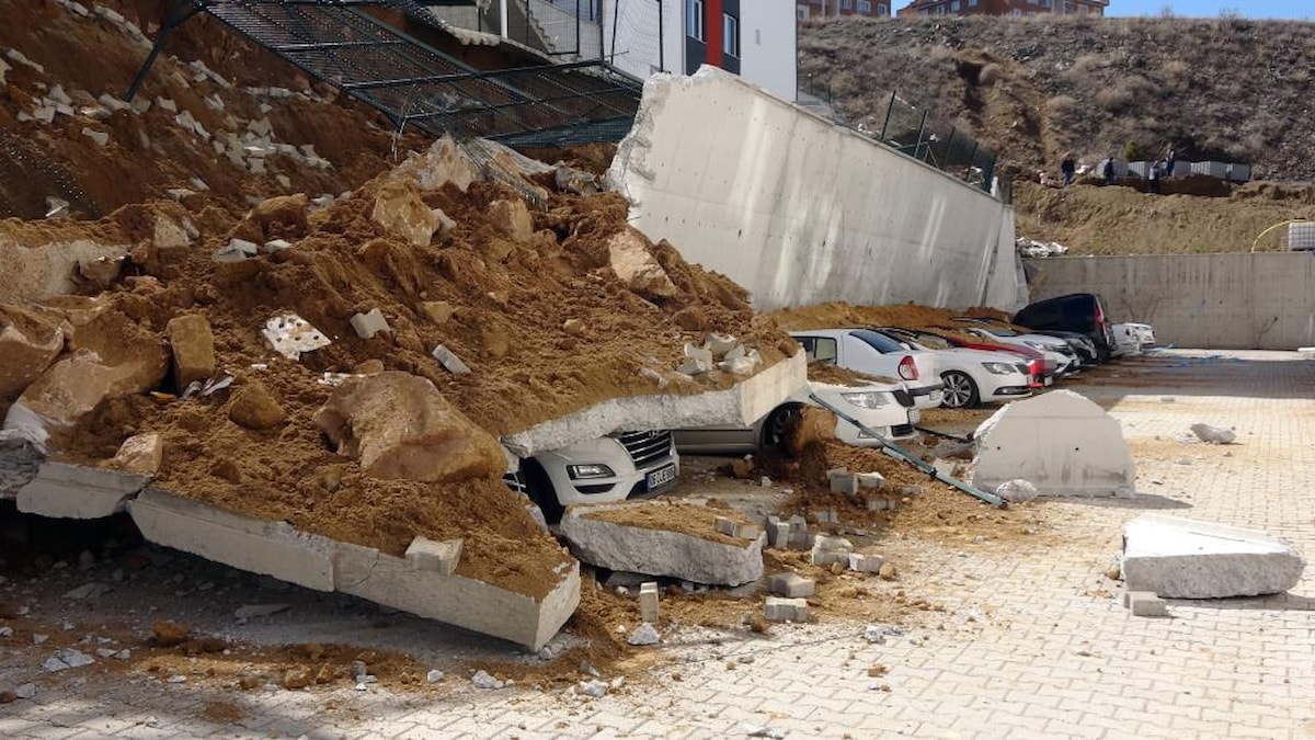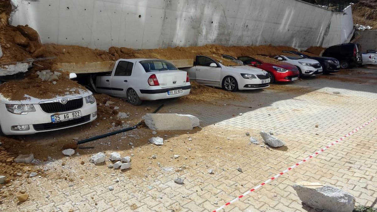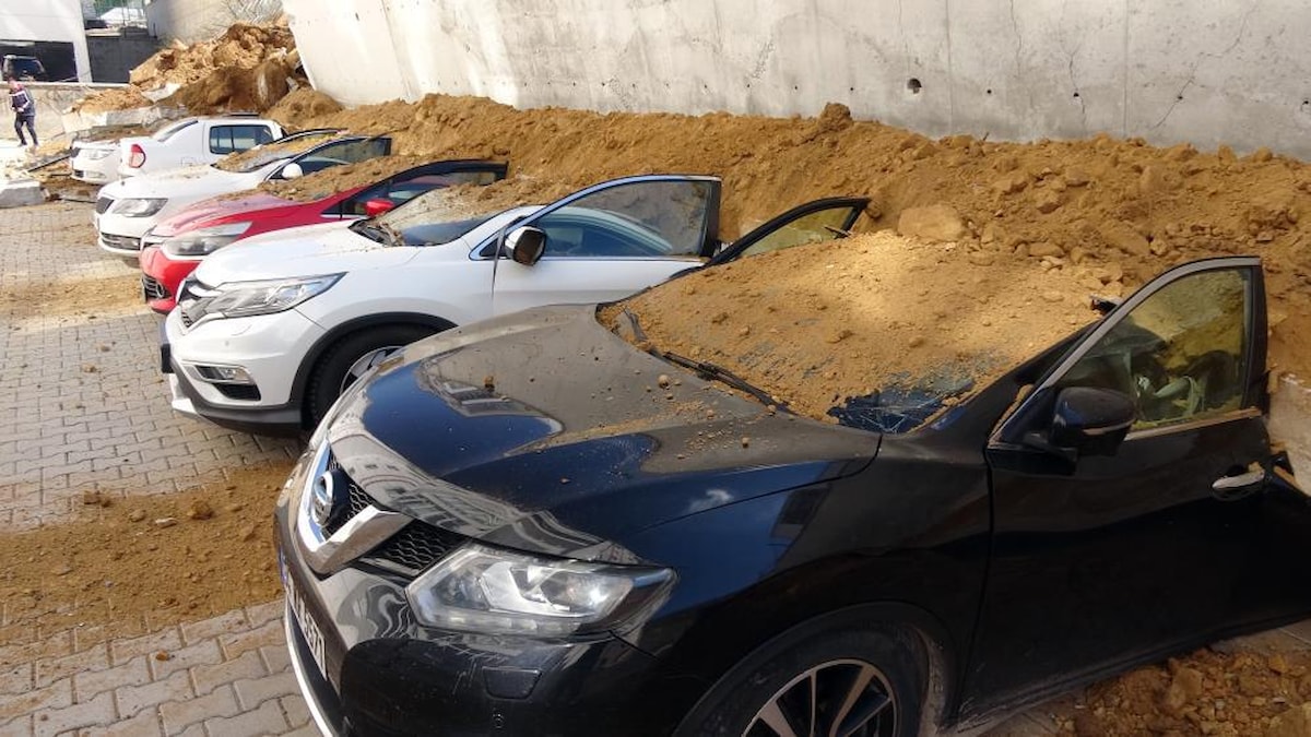 İki apartman arasındaki istinat duvarının çökmesi ve 11 otomobilin enkaz altında kalmasının güvenlik kamerası görüntüleri ortaya çıktı.