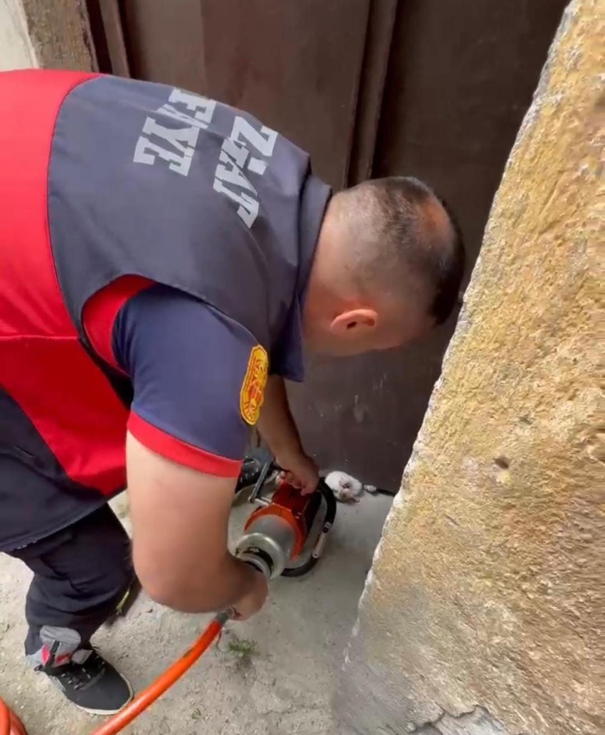 Apartman kapısının alt kısmına sıkışan kediyi kurtarmak için kapının demir aksamını keski yardımıyla genişleten ekipler, başarılı bir müdahaleyle kediyi bulunduğu yerden çıkardı.