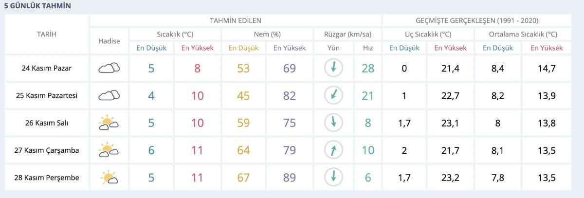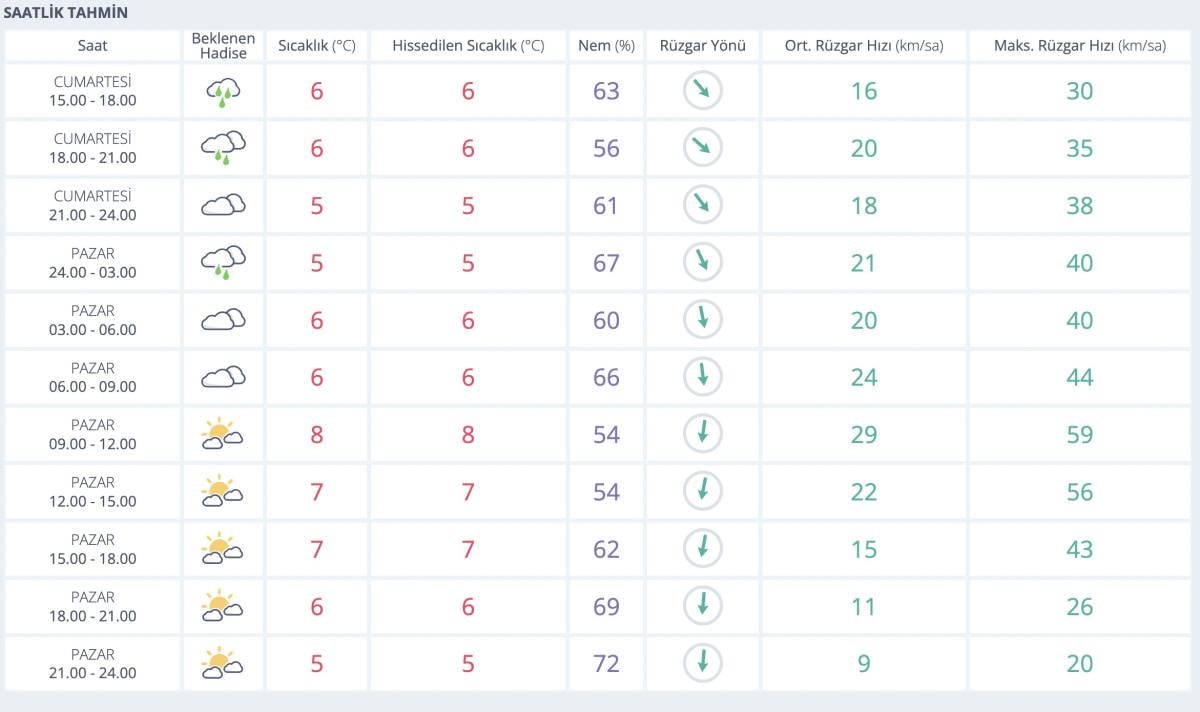 Parçalı ve çok bulutlu, öğle saatlerinden sonra yağmur ve sağanak yağışlı, yükseklerinin karla karışık yağmur ve kar yağışlı geçeceği tahmin ediliyor. Yağışların gece saatlerinde güney ve doğusunda kuvvetli olarak görülmesi bekleniyor. Rüzgârın; güneyli yönlerden kuvvetli olarak (40-70 km/saat) esmesi bekleniyor.