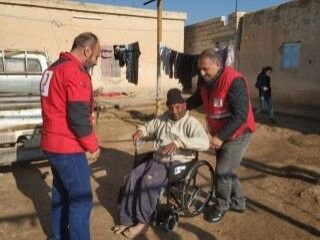 Çeşitli insani yardım malzemelerini dağıtmak üzere Telabyad’da bulunan Kızılay görevlileri, yanlarında getirdikleri tekerlekli sandalyeyi sahibine teslim etmek üzere Mişerfe köyüne gitti.