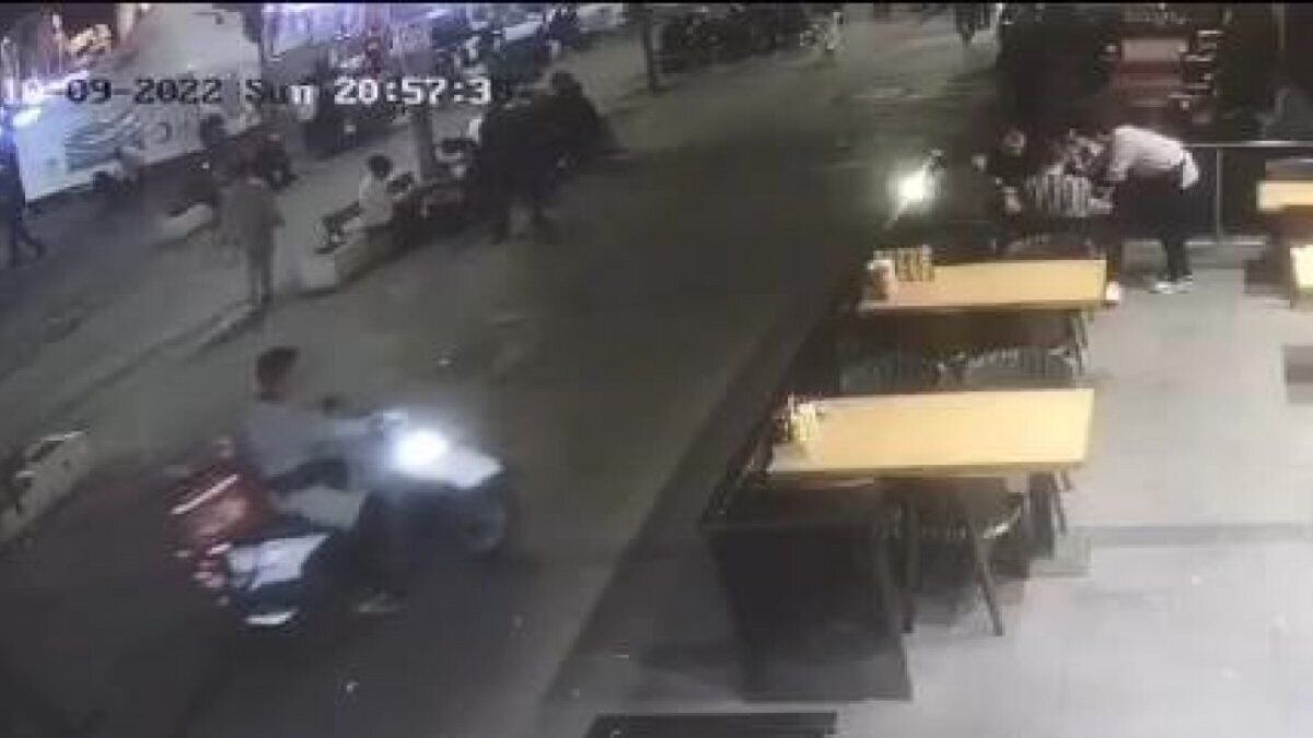 Görüntülerde, genç çocuğun motosikleti düzeltmeye çalıştığı sırada yayaların üzerine giderek yere düştüğü görülüyor.