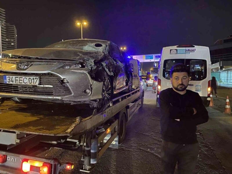 Orta şeritte gidiyorduk bir anda sanki üzerimize bir şey düşer gibi oldu. Adam karşı şeritten makas atarak geliyormuş. Kaldırıma vururken de arabası havalanmış. Bu hale koydu benden başka 4 araba daha var. İki kişiydik biz. Şurada duba ön camdan girdi zaten. Görünce yan yatmasam çok kötü sonuçlar olabilirdi.