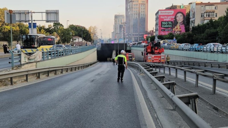 Polis, alt geçidi trafiğe kapatırken, itfaiye ekipleri yangına müdahalesini sürdürüyor.