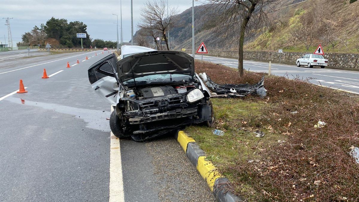 Zonguldak’ın Alaplı-Akçakoca karayolunun Belediye Plajlar mevkiinde meydana gelen kazada Y. Ö. idaresindeki otomobil, sürücüsünün direksiyon hakimiyetini kaybetmesi sonucu kayarak orta refüje çarptı.