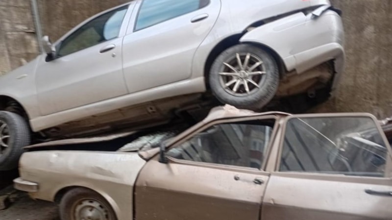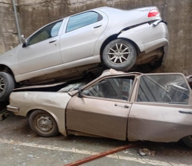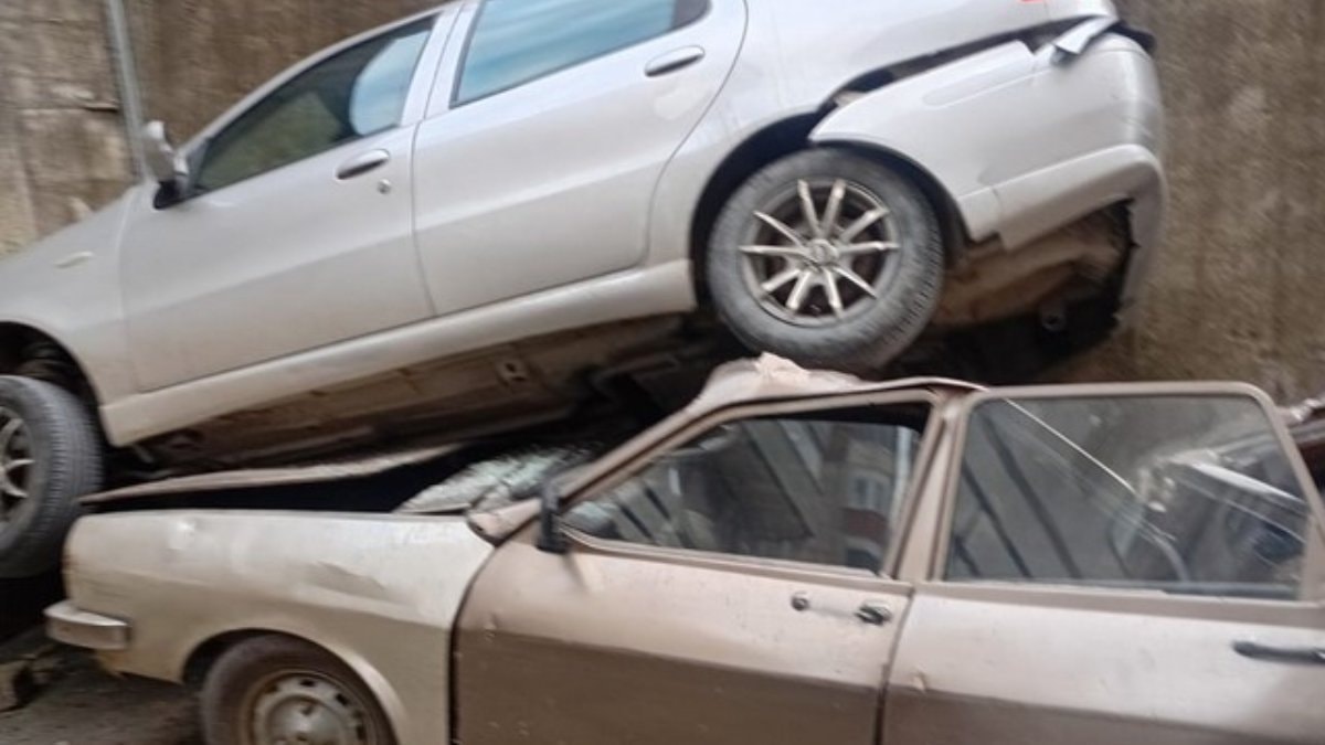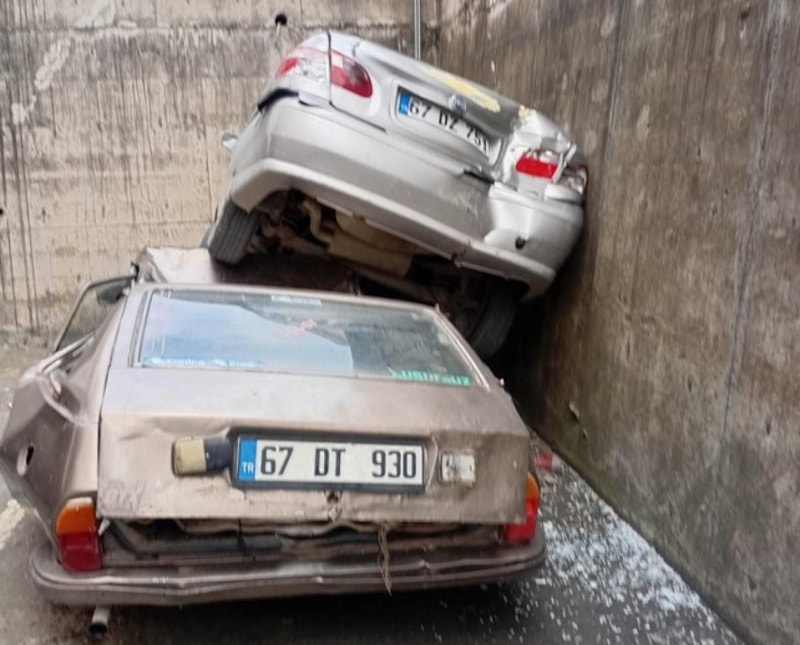 Araç, sürücünün direksiyon hâkimiyetini kaybetmesi sonucu yaklaşık 8 metre yükseklikten istinat duvarını aşarak alt bölümde park halindeki bir otomobilin üzerine düştü.