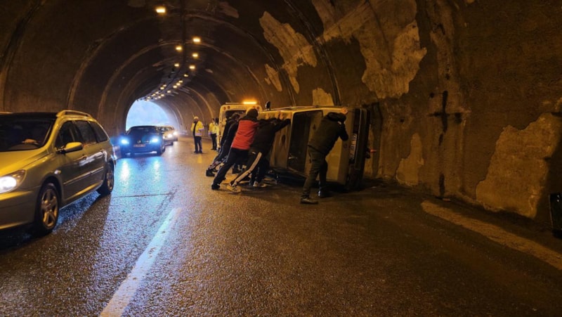Kontrolden çıkan otomobil, tünel içerisinde bir süre kaydıktan sonra devrildi.