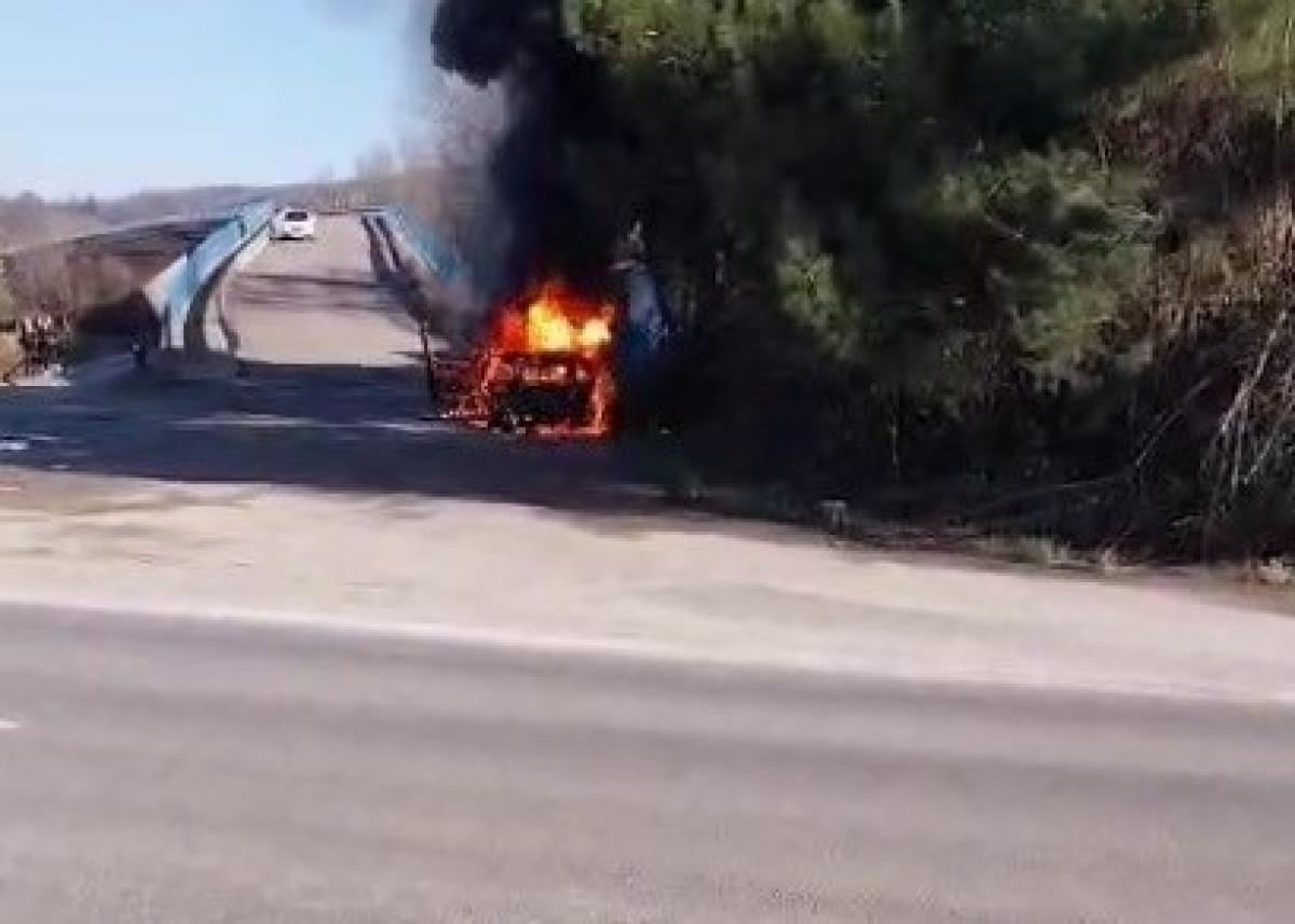 Yangın, yoldan geçen diğer sürücülerin ihbarı üzerine olay yerine sevk edilen itfaiye, sağlık ve polis ekiplerinin müdahalesiyle kontrol altına alındı. Alevlerin hızla sardığı otomobil tamamen yanarak adeta bir demir yığınına dönüştü.