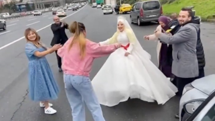 Köprüye gelen bir gelin konvoyu, araçlarını durdurdu ve köprü üzerinde oynamaya başladı.
