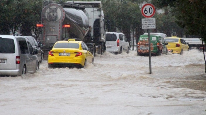 Su altında kalan yollarda sürücüler zor anlar yaşarken bazı araçlar ilerlemekle güçlü çekti.
