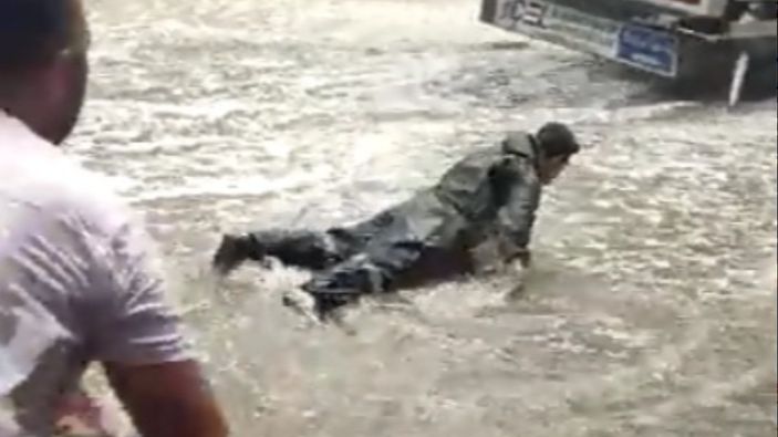 Bu arada bir kişinin sıcak havanın ardından kendisini su biriken yola yüzüstü attığını görenler şaşkınlık yaşadı.