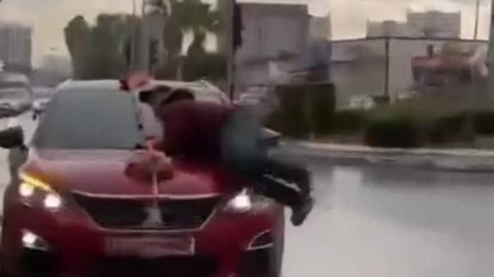 Adana’nın Yüreğir ilçesi Karataş Caddesi’nde, ilginç ve üzücü bir olay yaşandı. Düğün konvoyu ilerlerken, bir dilenci yolda gördüğü gelin arabasının kaputuna atladı. Hareket halindeki aracın durdurulmasını isteyen dilenci, para alana kadar inmemekte ısrar etti.