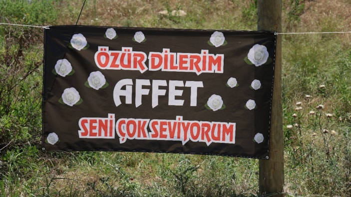 Çukurova ilçesine bağlı Yüzüncüyıl Mahallesi'nde bir ara sokağa üzerinde "Özür dilerim affet seni çok seviyorum" yazılı ilan asıldı.