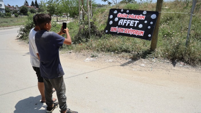 Bir ara sokağa, üzerinde "Özür dilerim affet seni çok seviyorum" yazılı ilan asıldı.