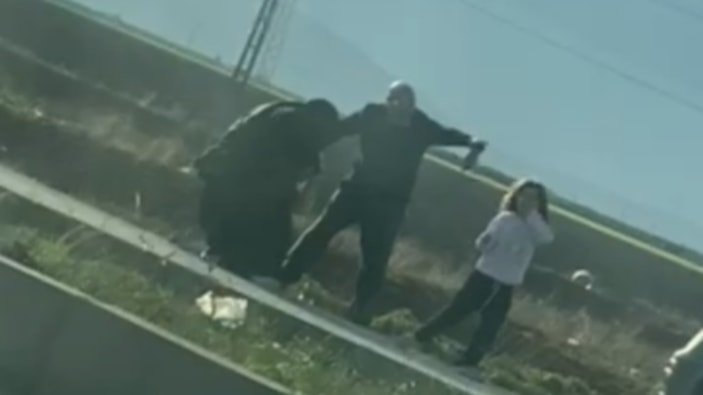 Bu sırada araçtaki kız çocuğu da inerek, çifte engel olmaya çalıştı. Adam, çocuğa tokat attı. Genç kadını araca bindiren çift, daha sonra yolculuğa devam etti.