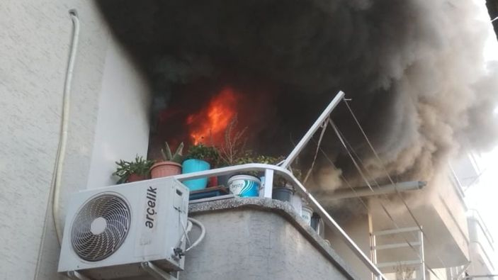 Evde bulunan anne Emine Ö. dumanlardan etkilenirken, vatandaşların yardımı ile balkondan atlayarak kurtuldu.