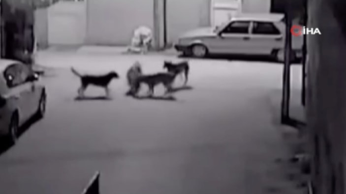 Adana'nın merkez Yüreğir ilçesine bağlı Cumhuriyet Mahallesi'nde 4 sokak köpeği, gece gördükleri kedinin peşine düştü.