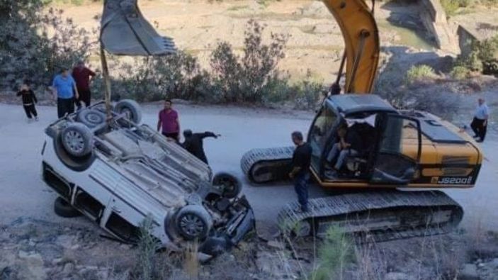 Kazadan sürücü yara almadan kurtulurken, şarampole devrilen otomobil iş makinası kepçesine halatlarla bağlanarak bulunduğu yerden çıkarıldı.