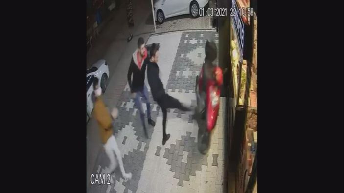 Ardından saldırgan iş yeri önünde servis yapılan motosikleti tekmeleyerek zarar verdi. Saldırgan, yanındaki şahıslar tarafından güçlükle sakinleştirip araca alındıktan sonra olay yerinden ayrıldı.
