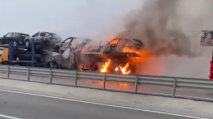 Sıfır araç taşınan TIR'da çıkan yangında 6 araç kullanılamaz hale geldi.
