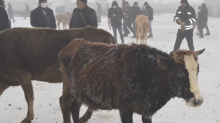 Ağrı'da satışa çıkan hayvanların üstü buz tuttu