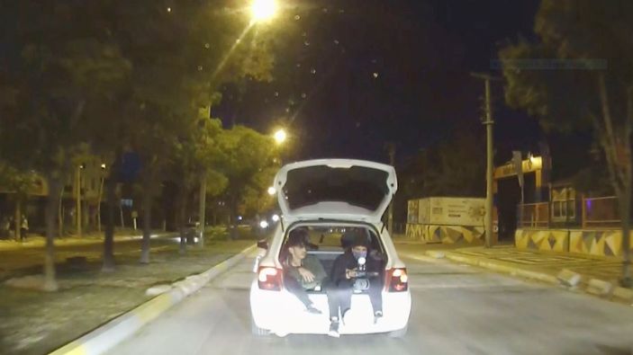 Ardından tehlikeye aldırış etmeden seyir haline geçen sürücü, bagajda oturan 2 genci de yok sayarak trafikte hızla ilerledi.