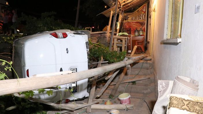 Aksaray'da hafif ticari araçla çarpışan otomobil, müstakil bir evin bahçesine düştü. Masada oturan aileye çarpmaya ramak kalırken, kazada şoka giren iki kız kardeşi sağlık görevlisi el ele tutuşturdu.