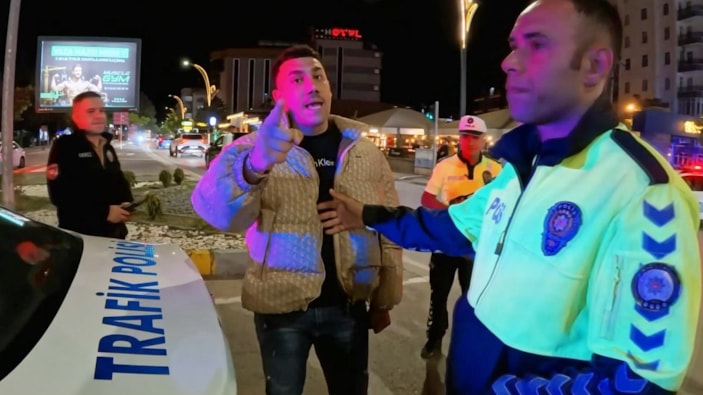 Aksaray’da yolda zikzak çizerek trafiği tehlikeye düşürdüğü iddiasıyla polis ekiplerince durdurulan sürücü, memurlara durdurulmasının anlamsız olduğunu söyledi. Uygulamayı görüntüleyerek görevini yapan basın mensubuna da tepki gösteren sürücü, önce tehdit ederek "Kaburgasız" dedi, sonra poz verip "Boydan çek" dedi.
