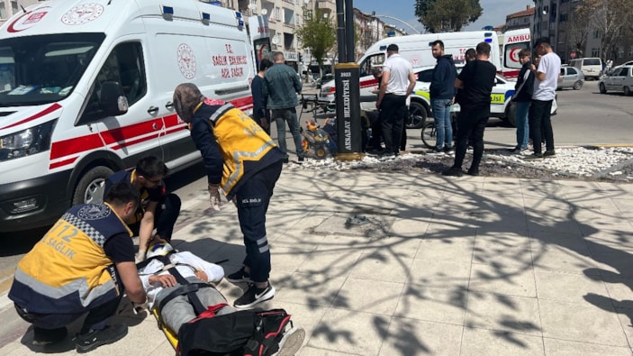 Aksaray'da kurye Efe K. yönetimindeki motosiklet ile Zehra G. yönetimindeki plakasız elektrikli bisiklet çarpıştı.