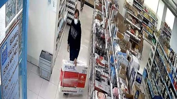 Gündüz saatlerinde girdiği marketten kutulu televizyon çalmaya çalışan şüpheli, güvenlik kamerasına yansıdı.