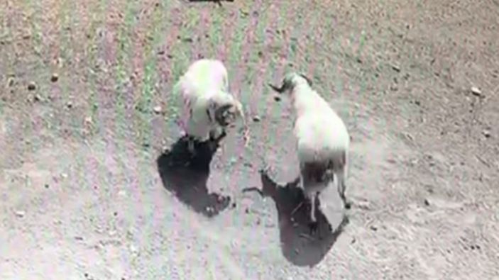 Ahırın önünde karşı karşıya gelen koçların çarpışması, güvenlik kamerasına yansıdı.