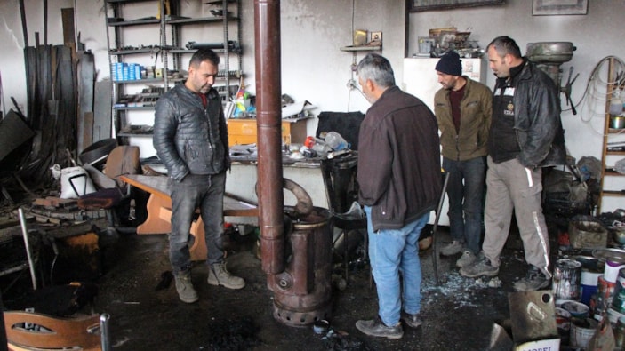 Amasya'nın Göynücek ilçesinde römork imalatı yapan bir atölyede çalışan stajyer öğrenciler, ısınmak için yaktıkları sobada ateşi alıştırmak için tiner kullandı.