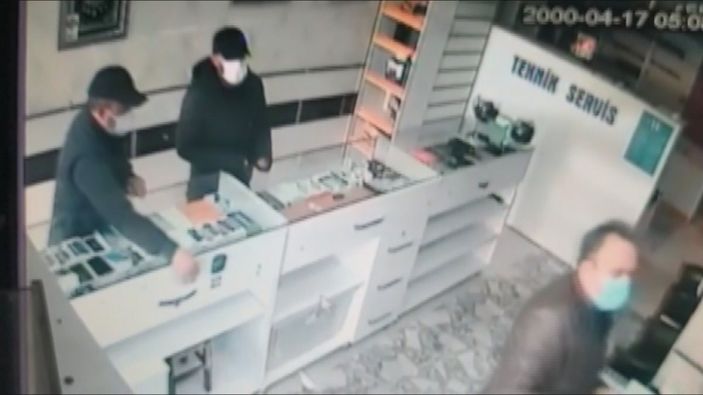 Geldikleri cep telefonu dükkanındaki çalışanı oyalayan 2 şüphelinin hırsızlık anları kameraya yansıdı.