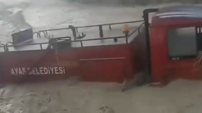 Ayaş ilçesinde sağanak sele neden olurken, bir itfaiye aracının sele kapıldığı anlar görüntülendi.