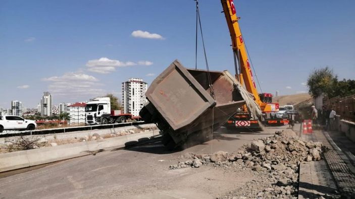 Ankara'da kontrolden çıkan hafriyat kamyonu devrildi