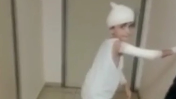 Videoda, vücudunun bazı noktalarının sarılı olduğu görülen küçük çocuğun yürümekte zorlandığı görüldü.