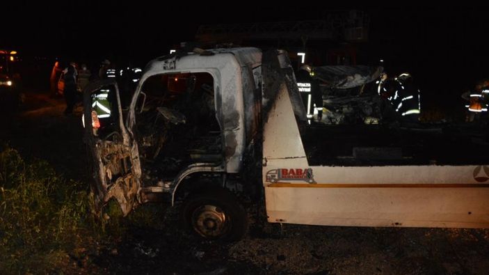 Çarpışmanın etkisiyle aracın benzin deposunun patlaması sonucu yangın çıktı. Kazada 07 GAD 14 plakalı kamyonetteki sürücü Sabri Kavuk (30) ile yanında bulunan İsa İşlek (32) sıkıştıkları yerden çıkamayınca araç içinde yanarak yaşamlarını yitirdi.