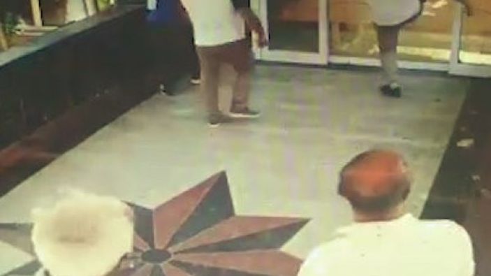 Elinde tahra olan bir kişinin de kapının kırılan camlarını parçalamaya devam ettiği görülüyor. Ardından içeriye giren grup, otel personellerinden birini darp ederek, kadın bir personeli de tahra ile tehdit edip dışarı çıkarıyor.