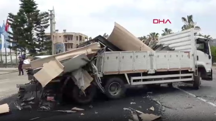 Gazipaşa ilçesinde sürücüsünün direksiyon hakimiyetini kaybettiği sıcak asfalt yüklü kamyon, yol kenarındaki durağa ve aynı yönde ilerleyen başka bir kamyona çarptıktan sonra akaryakıt istasyonunda devrildi.
