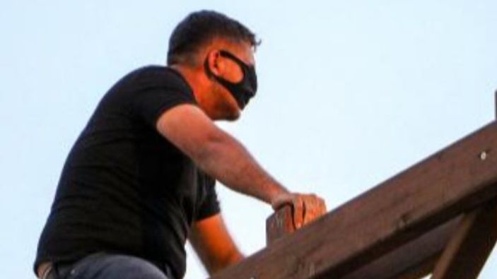 Üst geçidin korkuluklarına tutunan H.E., zaman zaman aşağı sarktı. Bu sırada H.E., ağzında bulunan maskeyi yüzünü kapatmak için kullandı.