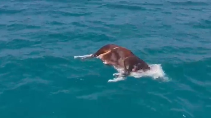 Bugün öğle saatlerinde, Antalya'nın Alanya ilçesi açıklarında, bir vatandaş tekne ile denizde gezinti yaptığı sırada, sahilden çok uzak olmayan bir noktada hareketsiz şekilde duran büyükbaş hayvanı fark etti. Gördüğü manzara karşısında kısa süreli hayrete düşen vatandaş, durumu yetkililere bildirdi.