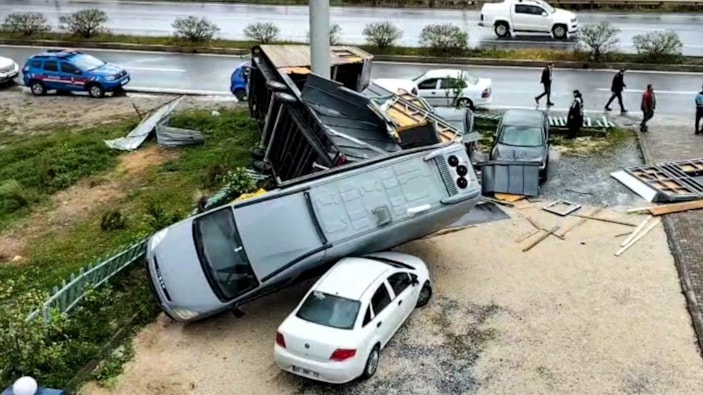 Antalya'da hortumun havalandırdığı minibüs, otomobilin üzerine düştü