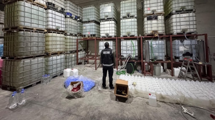 Antalya'nın Konyaaltı ilçesinde düzenlenen kaçak içki operasyonunda, 28 bin 340 litre etil alkol, 8 bin şişe kapağı, 2 bin aroma şişesi, 150 kilogram PH düşürücü madde, 150 kilogram karbon kömürü, 80 litre gliserin, 2 damıtma makinesi, 1 tabanca, 2 şarjör ve 15 fişeğe el konuldu.