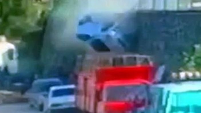 Kontrolden çıkan aracın, 5 metrelik istinat duvarından düştüğü o anlar kameraya yansıdı.